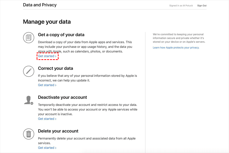Schritt 2: Klicken Sie in der Apple-ID- und Datenschutzoberfläche auf „Fortfahren“ und wählen Sie unter „Eine Kopie Ihrer Daten erhalten“ die Option „Erste Schritte“.