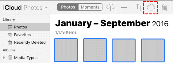 Schritt 3: Öffnen Sie iCloud Fotos und wählen Sie die Fotos aus, die Sie verschieben möchten. Klicken Sie dann in der oberen Taskleiste auf „Herunterladen“. Ihre Fotos werden auf die externe Festplatte verschoben, wenn Sie das Downloadziel zuvor in MultCloud auf Ihre Festplatte geändert haben.