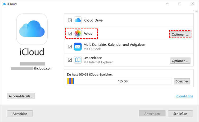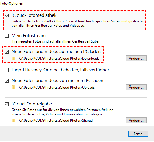 Schritt 3: Wählen Sie „iCloud-Fotomediathek“ und „Neue Fotos und Videos auf meinen PC laden“. Klicken Sie dann auf „Fertig“ und „Übernehmen“.