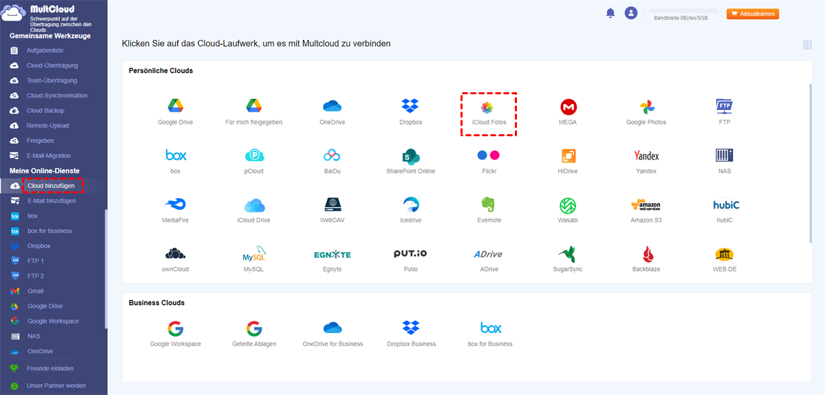 MultCloud ist ein professioneller Cloud-Verwaltungsdienst, mit dem Sie alle Ihre Cloud-Dateien zusammenführen und auf einer einzigen Plattform verwalten können. Außer dem Hinzufügen verschiedener Cloud-Speicherdienste können Sie auch verschiedene Konten einer Cloud kostenlos zu MultCloud hinzufügen. Wenn Sie also 2 iCloud Fotos-Konten haben, können Sie beide zu MultCloud hinzufügen und Fotos von ihnen herunterladen, ohne die Anmeldekonten wechseln zu müssen.