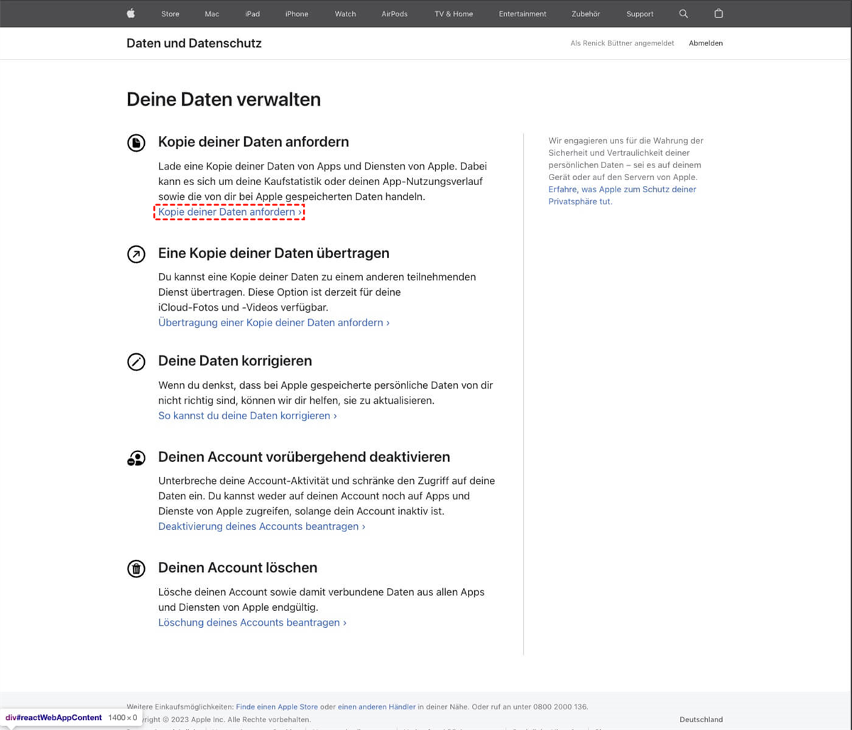 Schritt 2. Klicken Sie im Center auf „Kopie deiner Daten anfordern“.