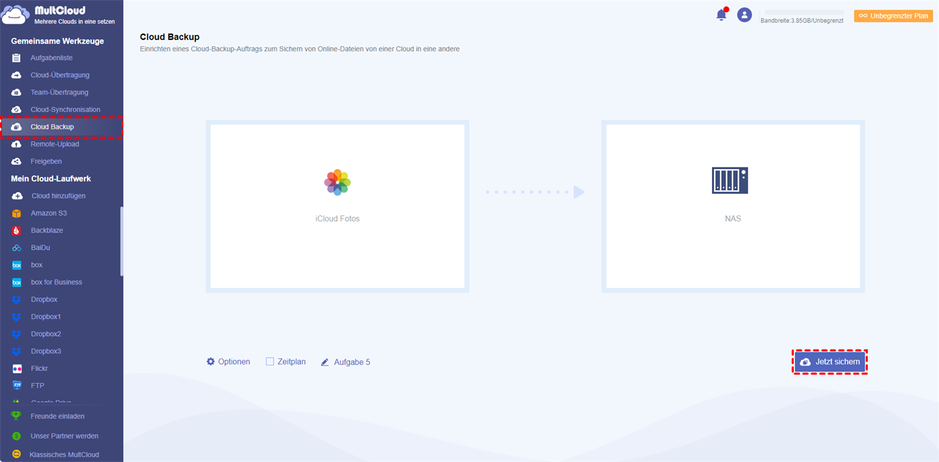 Wenn Sie Ihre iCloud Fotos automatisch auf NAS speichern möchten, ist die einfachste und schnellste Möglichkeit die Verwendung des Cloud-zu-Cloud-Sicherungsdienstes MultCloud. Als hervorragender Cloud-Dateimanager bietet MultCloud eine umfassende Plattform für Benutzer zur Verwaltung mehrerer Cloud-Dienste, wie iCloud Fotos, NAS, Amazon S3, OneDrive, Google Drive, Flickr, MEGA usw.