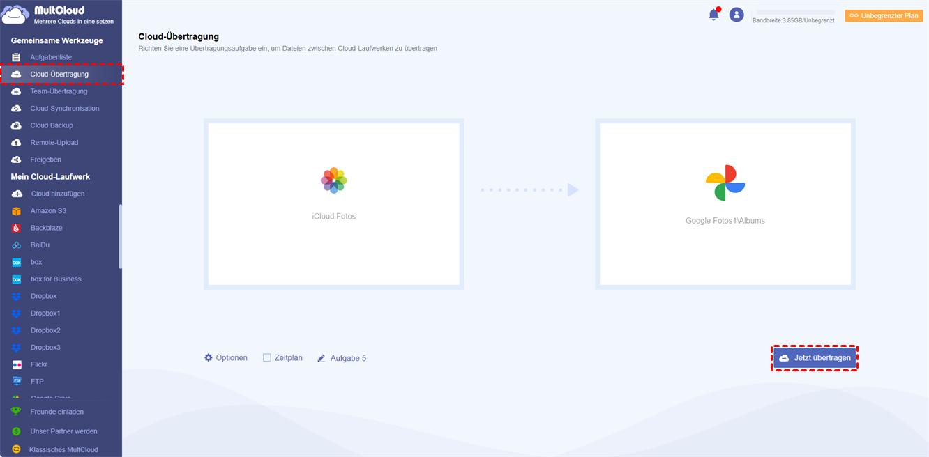 Alles, was Sie brauchen, ist ein MultCloud-Konto und fügen Sie Ihre Clouds zu ihm hinzu. Dann können Sie in der „Cloud-Übertragung“ Funktion iCloud Fotos als Quelle und einen Ort in einem anderen Cloud-Laufwerk als Ziel auswählen. Wenn Sie auf „Jetzt übertragen“ klicken, wird MultCloud Ihre ausgewählten Daten von iCloud auf eine andere Cloud so schnell wie möglich übertragen.