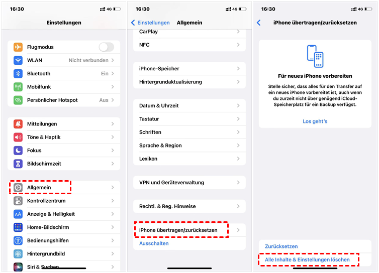 1. Gehen Sie bitte zu iPhone-Einstellungen > Allgemein > iPhone übertragen/zurücksetzen > Alle Inhalte & Einstellungen löschen.