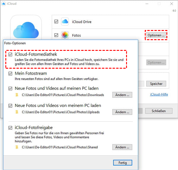 3. Wählen Sie iCloud-Fotomediathek aus, überprüfen Sie den Standardspeicherort für iCloud-Fotos und klicken Sie auf Fertig.