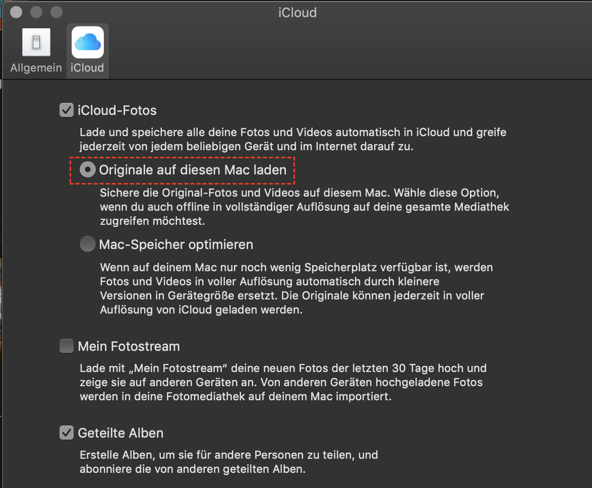 3. Wählen Sie „iCloud“, aktivieren Sie „iCloud-Fotos“ und wählen Sie „Originale auf diesen Mac laden“.