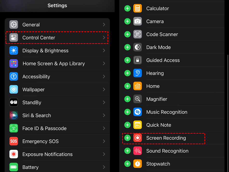 Hinweis: Wenn Sie die Aufnahmetaste nicht zum Kontrollzentrum hinzugefügt haben, können Sie Ihre „iPhone-Einstellungen“ öffnen> „Kontrollzentrum“ auswählen > auf das „+“-Symbol klicken, um „Bildschirmaufnahme“ zum Kontrollzentrum hinzuzufügen.