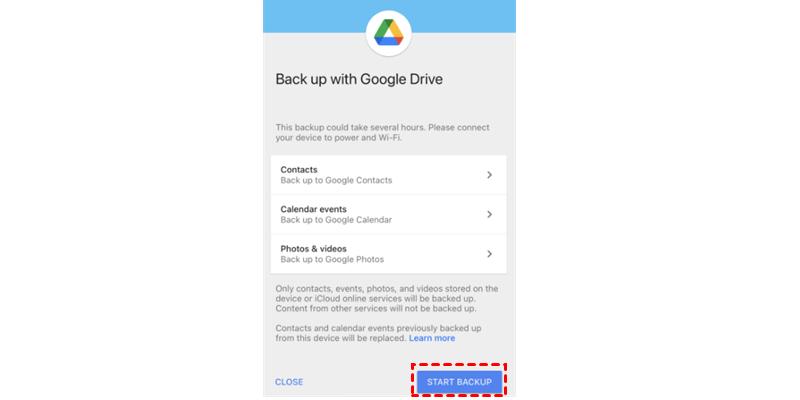 Schritt 3: Wählen Sie „Backup“ und „Fotos & Videos“. Klicken Sie dann auf „BACKUP STARTEN“ und die Fotos werden auf Google Drive gesichert.