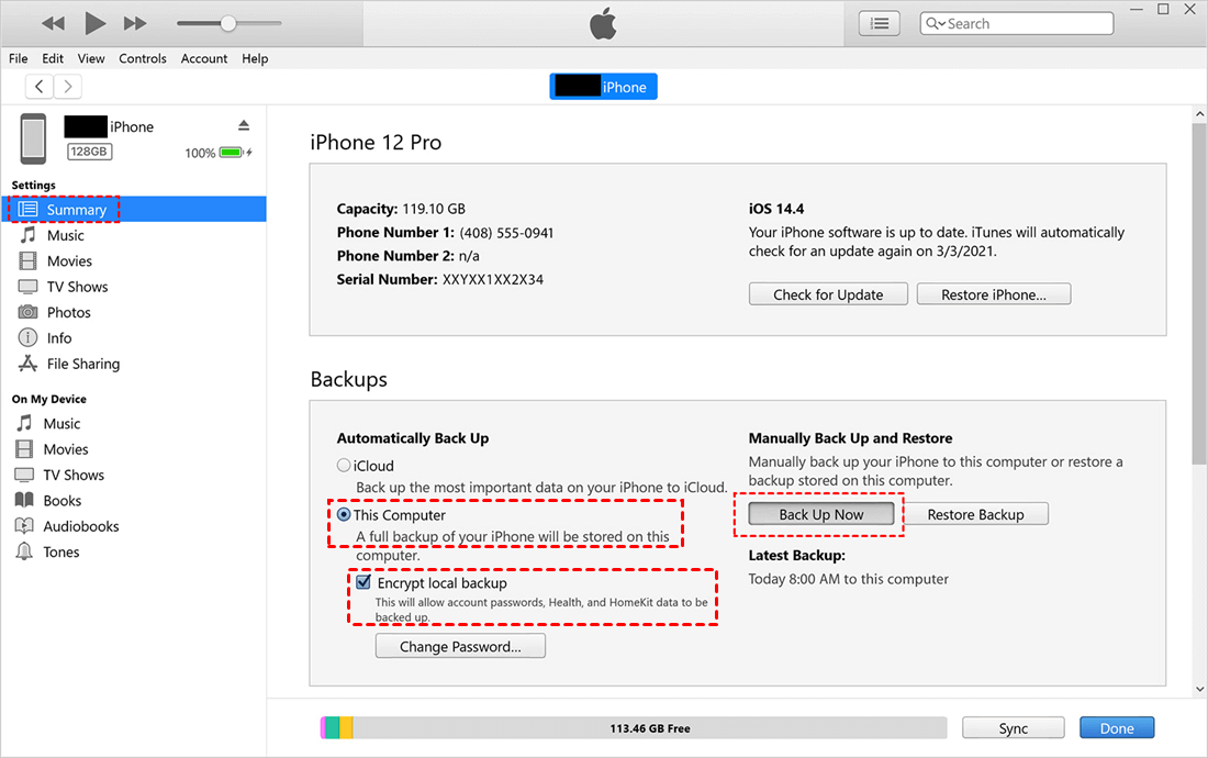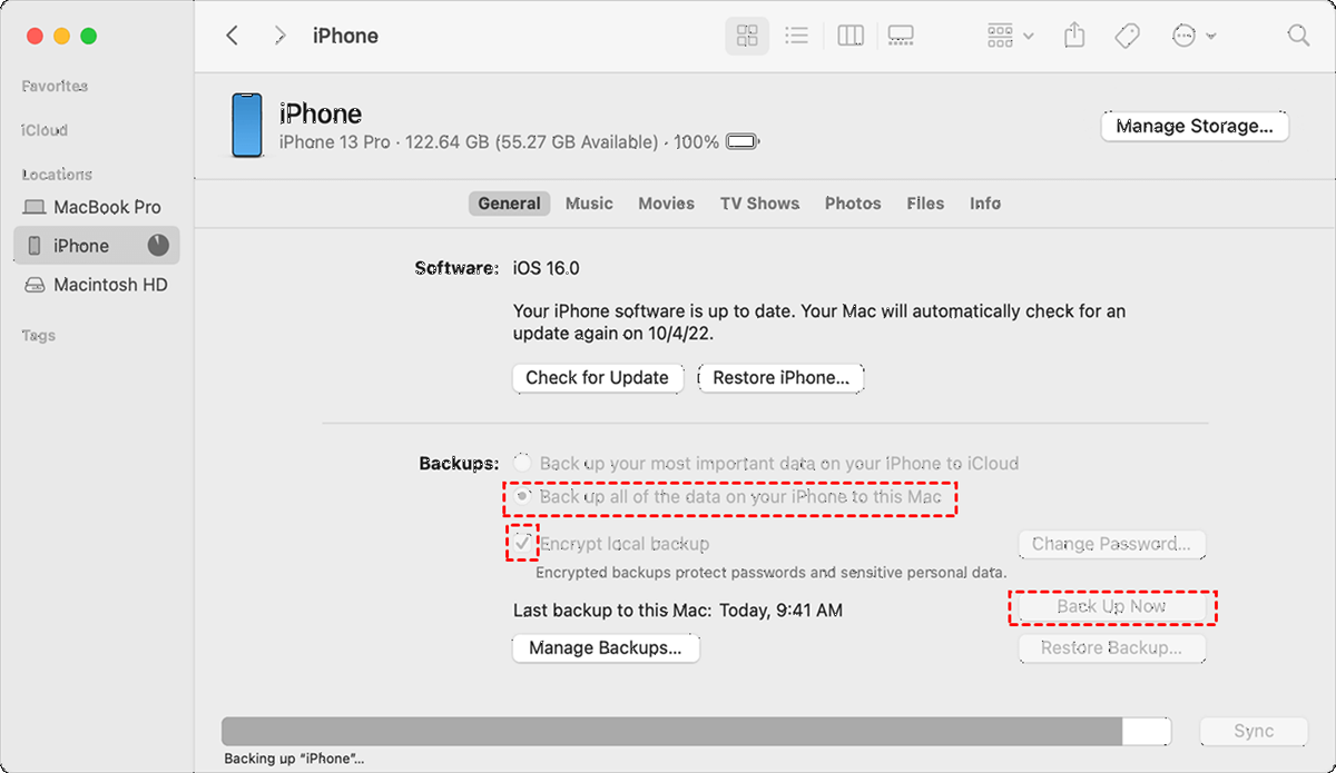 Schritt 3: Wählen Sie „Alle Daten Ihres iPhones auf diesem Mac sichern“. Wenn Sie mehr Sicherheit wünschen, können Sie „Lokale Sicherung verschlüsseln“ aktivieren und ein Kennwort festlegen. Wenn Sie dies nicht tun, klicken Sie einfach auf „Jetzt sichern“. Dann werden die Fotos auf Ihrem Mac gesichert.