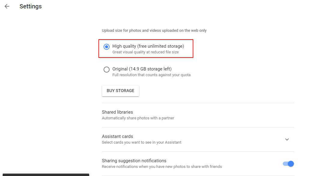 Um Speicherplatz zu sparen, laden Sie Ihre Fotos/Videos besser in „Hoher Qualität” hoch. Wenn diese Option aktiviert ist, wird Ihr Google Drive-Speicherplatz nicht beansprucht. Sie können die Qualität der Bilder in den Einstellungen der Backup and Sync-App ändern.