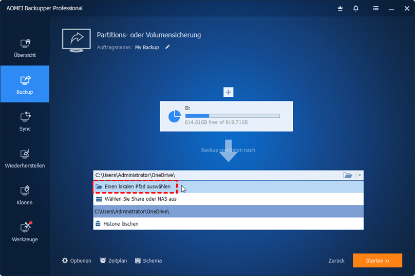 Lassen Sie uns nun herausfinden, wie Sie das Laufwerk D mit AOMEI Backupper Standard auf OneDrive sichern können: