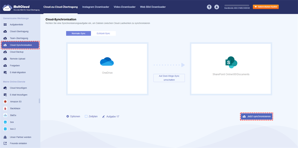MultCloud ist ein professioneller Cloud-Verwaltungsdienst und seine Cloud-Synchronisation-Funktion ermöglicht die Echtzeit-Sync von Dateien zwischen OneDrive und SharePoint. Neben der automatischen Dateisynchronisierung bietet Cloud-Synchronisation auch einige nützliche Synchronisationsmodi:
