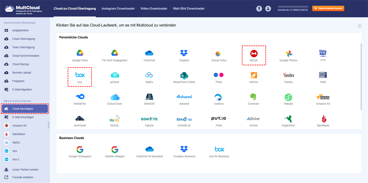 Jetzt können Sie jedoch kostenlos den praktischen webbasierten Multi-Cloud-Speichermanager MultCloud ausprobieren, mit dem Sie MEGA-Dateien ganz einfach und ohne Downloads und Uploads auf Box sichern können.