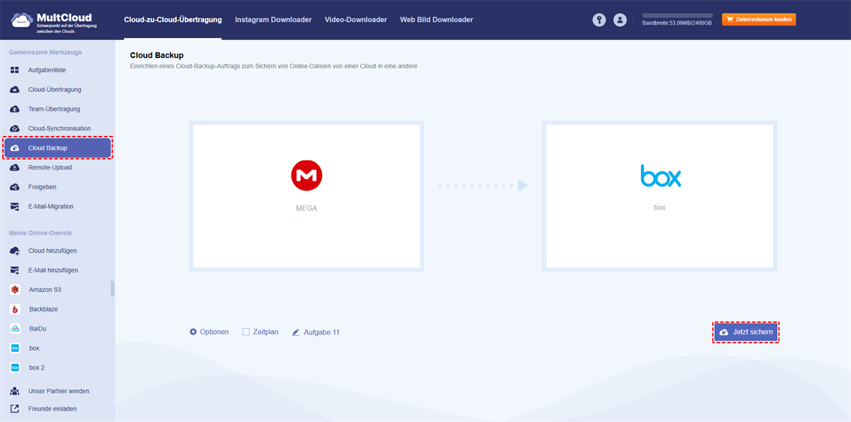 Hier finden Sie eine Schritt-für-Schritt-Anleitung, wie Sie MEGA-Dateien mit der Cloud-Backup-Funktion von MultCloud ganz einfach auf Box sichern.