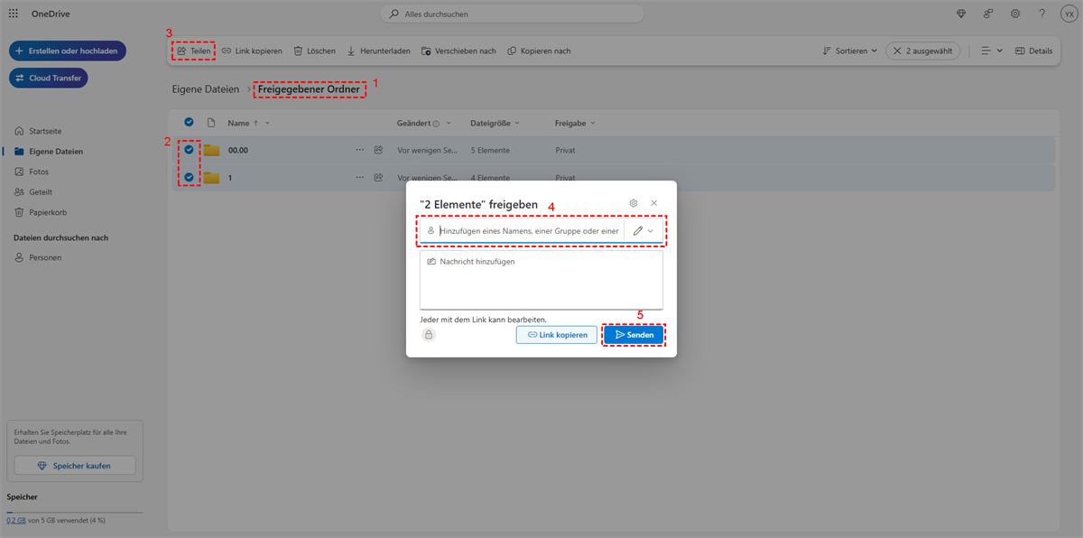 Schritt 4.Wählen Sie „Freigegebenen Ordner”, klicken Sie auf „teilen” und geben Sie Ihre E-Mail-Adresse ein, die mit dem neuen Konto verknüpft ist.