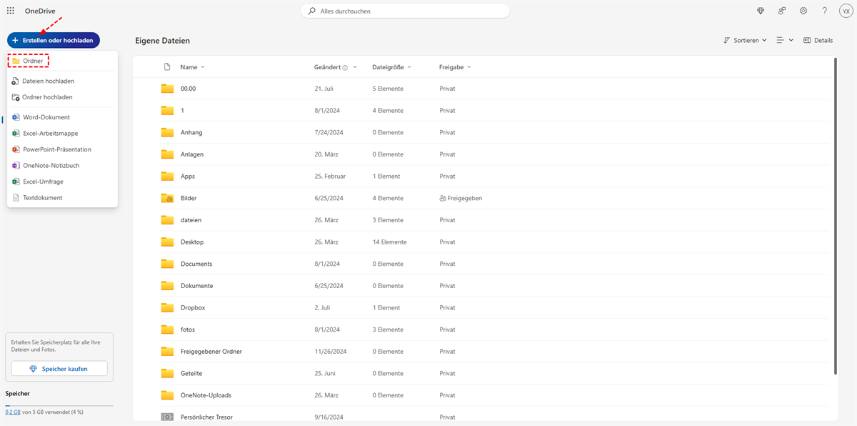 Schritt 2. Klicken Sie auf die Schaltfläche „+ Erstellen oder hochladen”, um einen neuen Ordner zu erstellen und benennen Sie ihn in „Freigegebener Ordner” um.