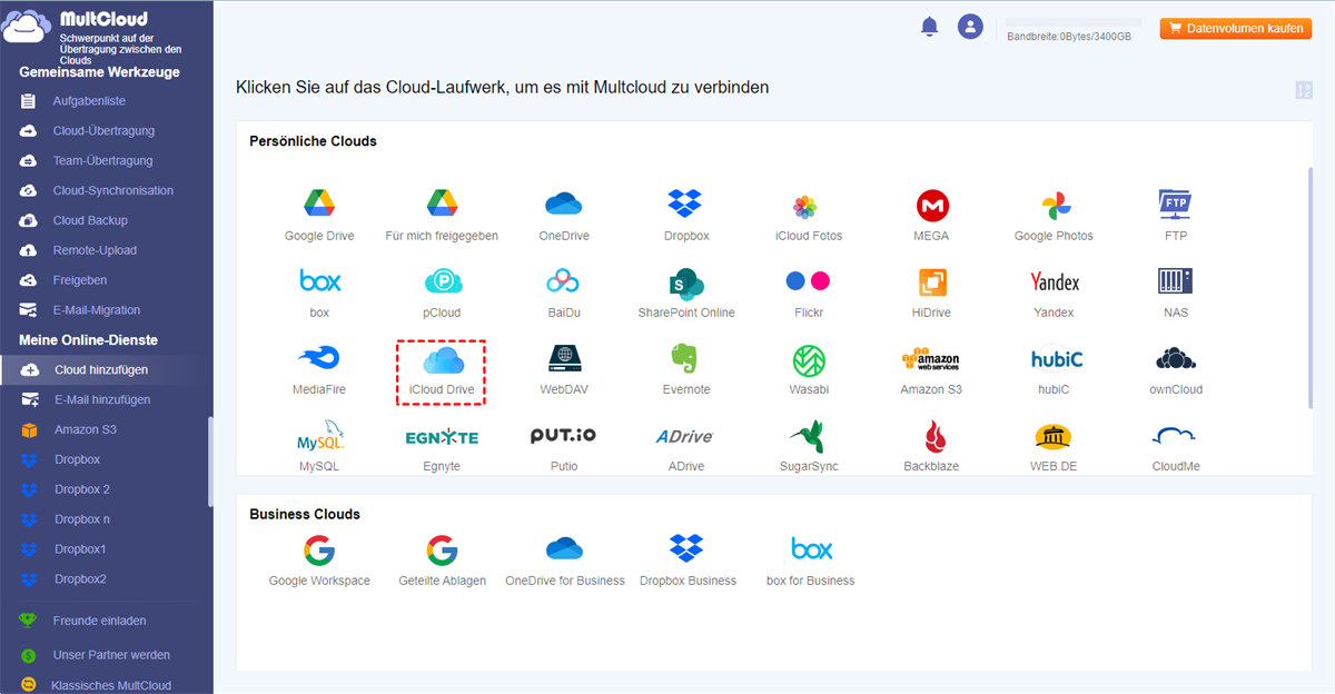 MultCloud unterstützt mehr als 30 beliebte Clouds und On-Premise-Dienste, einschließlich iCloud Drive, iCloud Photos, Google Photos, OneDrive, Amazon S3, usw. Wenn Sie Dateien von iCloud auf ein anderes Konto oder eine andere Cloud übertragen möchten, müssen Sie nur ein MultCloud-Konto erstellen und Ihre Clouds dazu hinzufügen. Dann wird Ihnen die Funktion „Cloud-Übertragung“ eine große Hilfe sein.