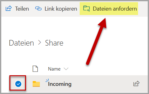 Fall 3: Endbenutzer benötigen einen OneDrive-Ordner, in dem externe Anbieter Dateien freigeben können, die zu groß für E-Mails sind. Wir haben die Freigabeoptionen sowohl für SharePoint Online als auch für OneDrive auf „Jeder“ eingestellt und verwenden Sicherheitsgruppen in SharePoint Online, um den externen Freigabeberechtigten einzuschränken. Die Option „Dateien anfordern“ finde ich jedoch nicht.