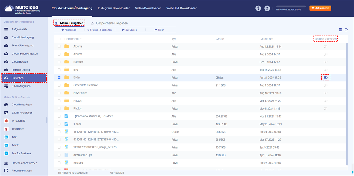 Schritt 6. Wechseln Sie zur Liste „Meine Freigaben“ und öffnen Sie die Option „Upload zulassen“ des freigegebenen Ordners. Ihre Empfänger können dann die benötigten Dateien und Ordner in den Dateianforderungsordner hochladen. Sie können direkt in OneDrive auf die hochgeladenen Daten zugreifen.