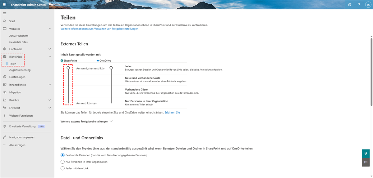 - Die SharePoint-Einstellungen für die externe Freigabe auf dieser Seite entsprechen denen im Microsoft 365 Admin Center unter „Organisationseinstellungen“ > „SharePoint“.