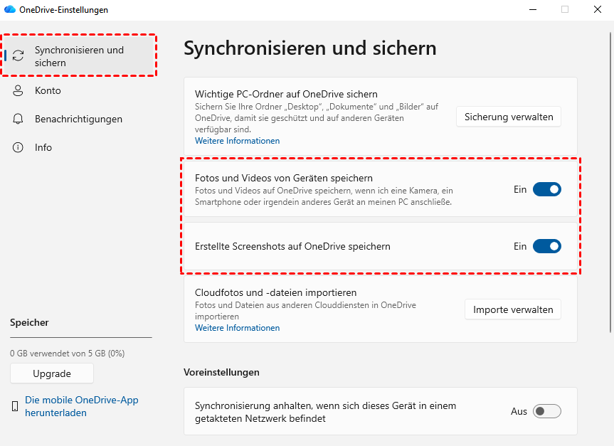 2. Aktivieren Sie „Fotos und Videos in OneDrive speichern“ und „Screenshots in OneDrive speichern“, um die externe Festplatte auf dem OneDrive-Server zu sichern.