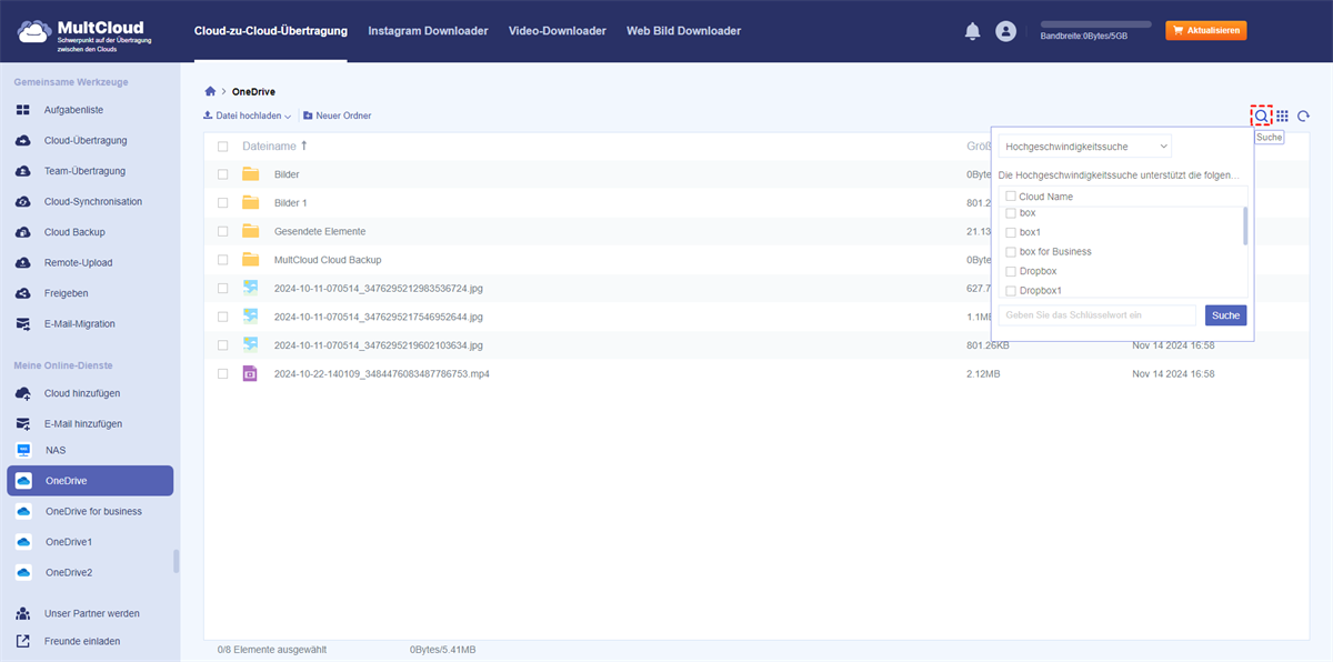 Sie können ganz einfach über die linke Liste „Meine Online-Dienste“ zwischen den Clouds wechseln. Und Sie können in all Ihren Clouds nach einer bestimmten Datei suchen, indem Sie einfach auf „Suchsymbol“ in der oberen rechten Ecke klicken.