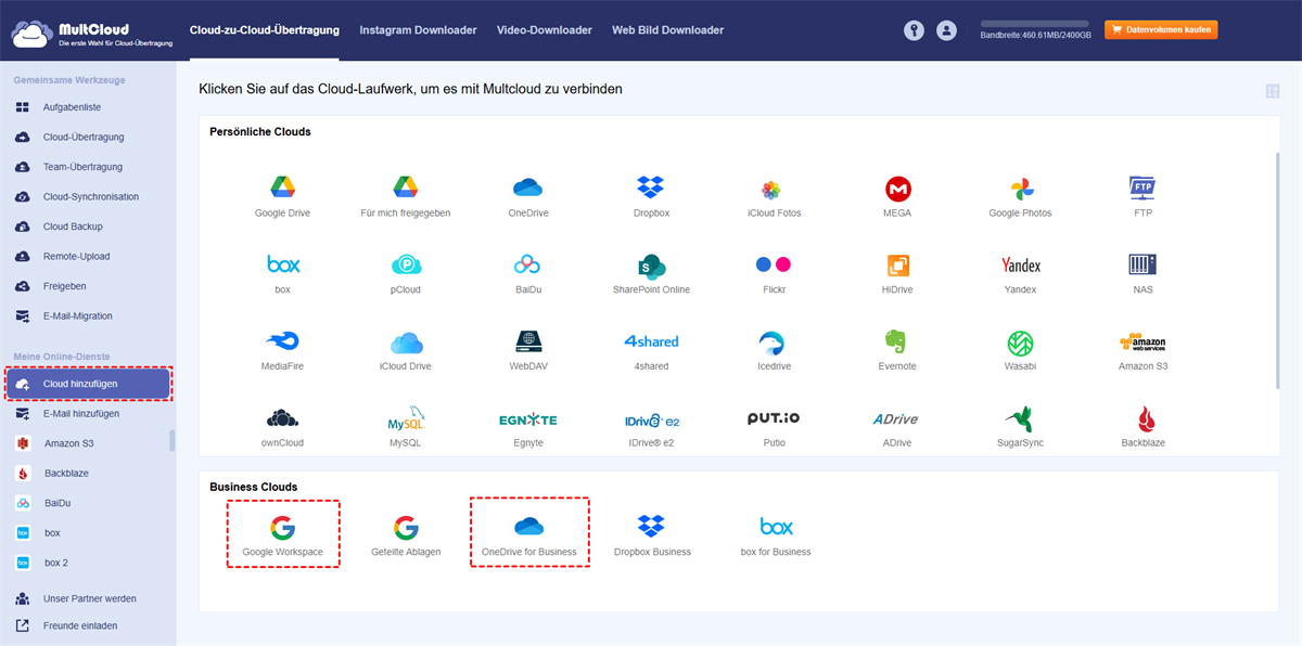 1. Fügen Sie OneDrive for Business und Google Workspace hinzu, indem Sie auf Cloud hinzufügen klicken.