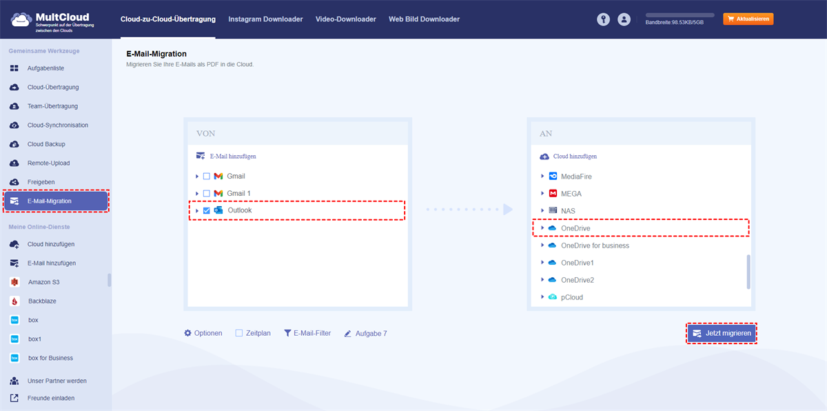 MultCloud ermöglicht nicht nur das Herunterladen aller Outlook-E-Mails auf einmal, sondern ermöglicht es Ihnen auch, alle Outlook-E-Mails direkt in eine andere Cloud zu migrieren, ohne sie herunterzuladen, um sie zu archivieren, sehr einfach und nützlich.