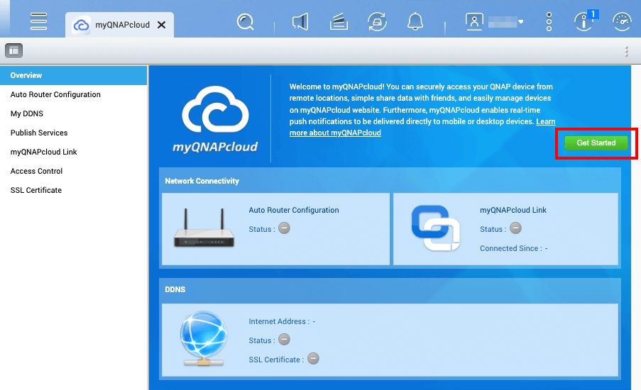 Schritt 1: Melden Sie sich bei Ihrer QNAP NAS an. Öffnen Sie myQNAPcloud und klicken Sie auf „Losgehen“.