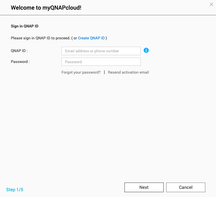 Schritt 2: Das Fenster „Willkommen bei myQNAPcloud!“ wird angezeigt. Geben Sie Ihre „QNAP ID“ und Ihr „Passwort“ ein, um Ihre NAS zu registrieren. Klicken Sie auf „Weiter“, um zum nächsten Schritt zu gelangen, und geben Sie einen „Geräte“-Namen für Ihre NAS ein.