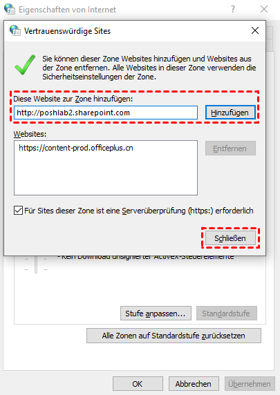 Schritt 3. Geben Sie dann in das Feld „Diese Website zur Zone hinzufügen“ die SharePoint-URL ein. Klicken Sie auf „Hinzufügen“ und „Schließen“.