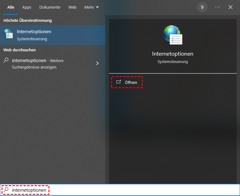 Schritt 1. Klicken Sie auf die Schaltfläche „Start“, und geben Sie dann „Internetoptionen“ in das Suchfeld ein. Klicken Sie dann auf die Schaltfläche „Öffnen“.