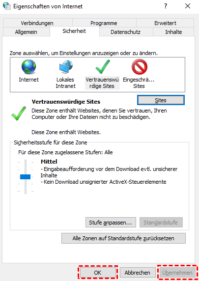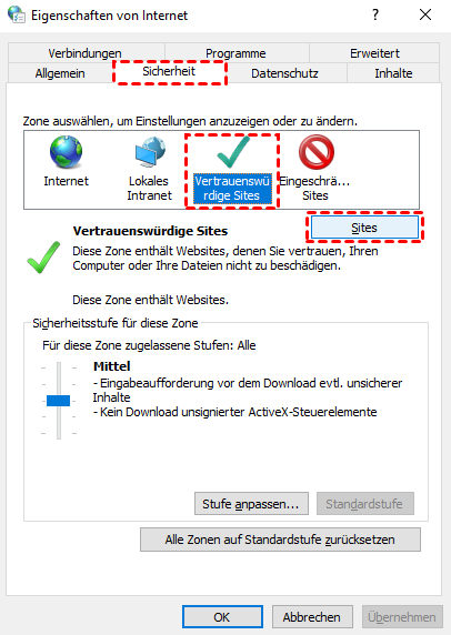 Schritt 2. Im Fenster „Eigenschaften von Internet“ gehen Sie auf die Registerkarte „Sicherheit“. Klicken Sie in der Zonenliste auf „Vertrauenswürdige Sites“. Klicken Sie dann auf „Sites“.