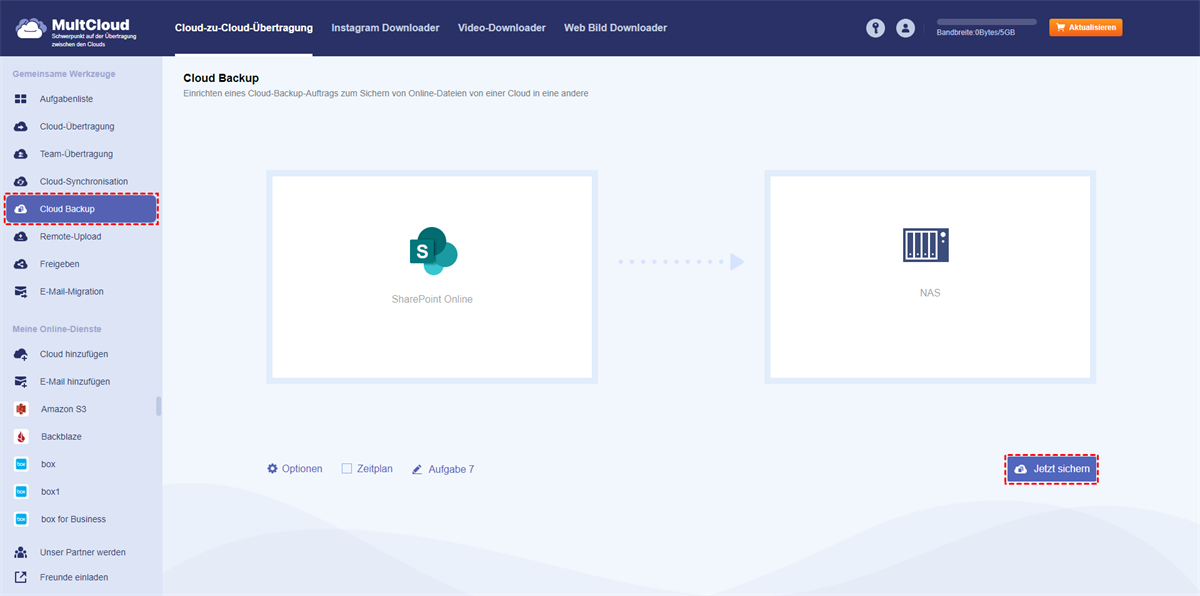 Schritt 3: Gehen Sie zu Cloud Backup in der linken Navigation, und Sie sehen zwei Kästchen im Hauptbildschirm. Tippen Sie als Nächstes auf das erste Quadrat, um SharePoint Online auszuwählen, und drücken Sie dann auf das zweite Quadrat, um NAS auszuwählen. Drücken Sie anschließend auf die Registerkarte Jetzt sichern.