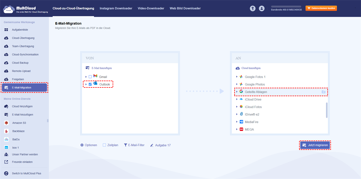 Darüber hinaus können Sie, wenn Sie einen geteilte Ablage nutzen möchten, auch MultCloud-Funktionen verwenden, um ihn mit Microsoft-Diensten wie OneDrive, Outlook und OneDrive for Business zusammenarbeiten zu lassen. Beispielsweise können Sie E-Mail-Migration nutzen, um Outlook-E-Mails stapelweise als PDF-Dateien in Google geteilte Ablage zu speichern.