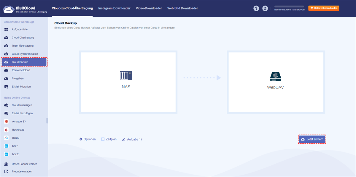 Bisher haben Sie wahrscheinlich die beste Methode für Synology NAS-Backup auf WebDAV kennengelernt. Sollten Sie jedoch Probleme beim Sichern Ihres Synology NAS über WebDAV mit Hyper Backup haben, können Sie MultCloud ausprobieren.