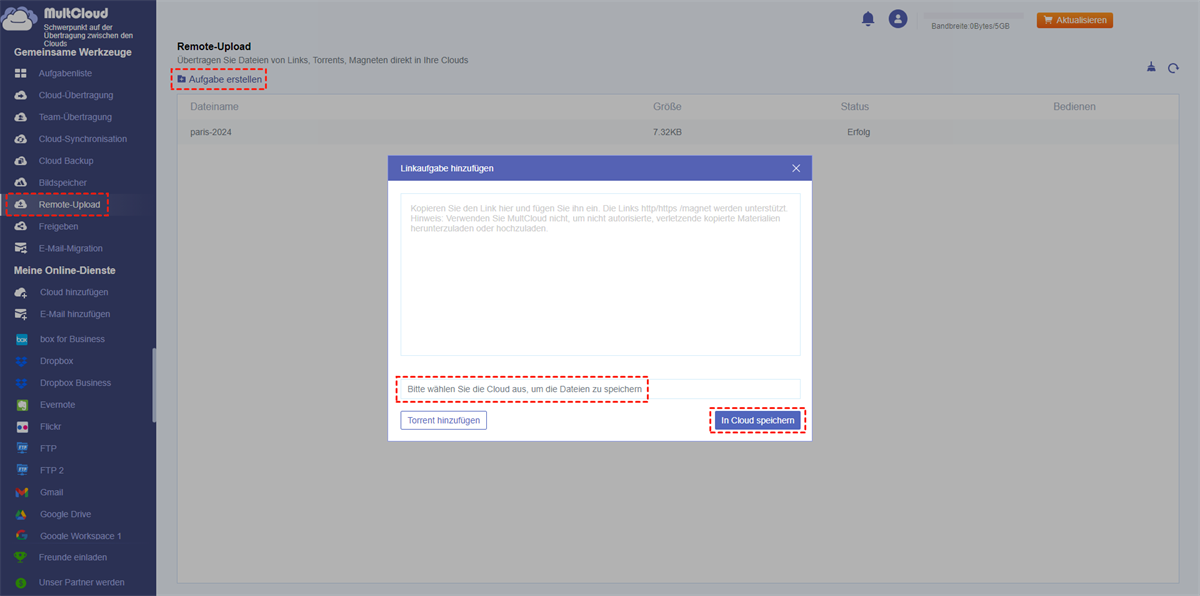 Glücklicherweise gibt es einen Cloud-Dateimanager namens MultCloud, der diese Anforderung erfüllen kann. Abgesehen von seiner Hauptverwendung in der Cloud-zu-Cloud-Übertragung, Synchronisierung oder -Sicherung ist er auch ein hervorragender Cloud-Torrent-Server. Sie können Daten von Torrents, URLs oder Magnet-Links zu mehr als 30 Arten von Cloud-Speicherdiensten mit Ihrem Telefon/iPad/PC herunterladen, ohne Torrent-Parsing-Clients herunterladen zu müssen.