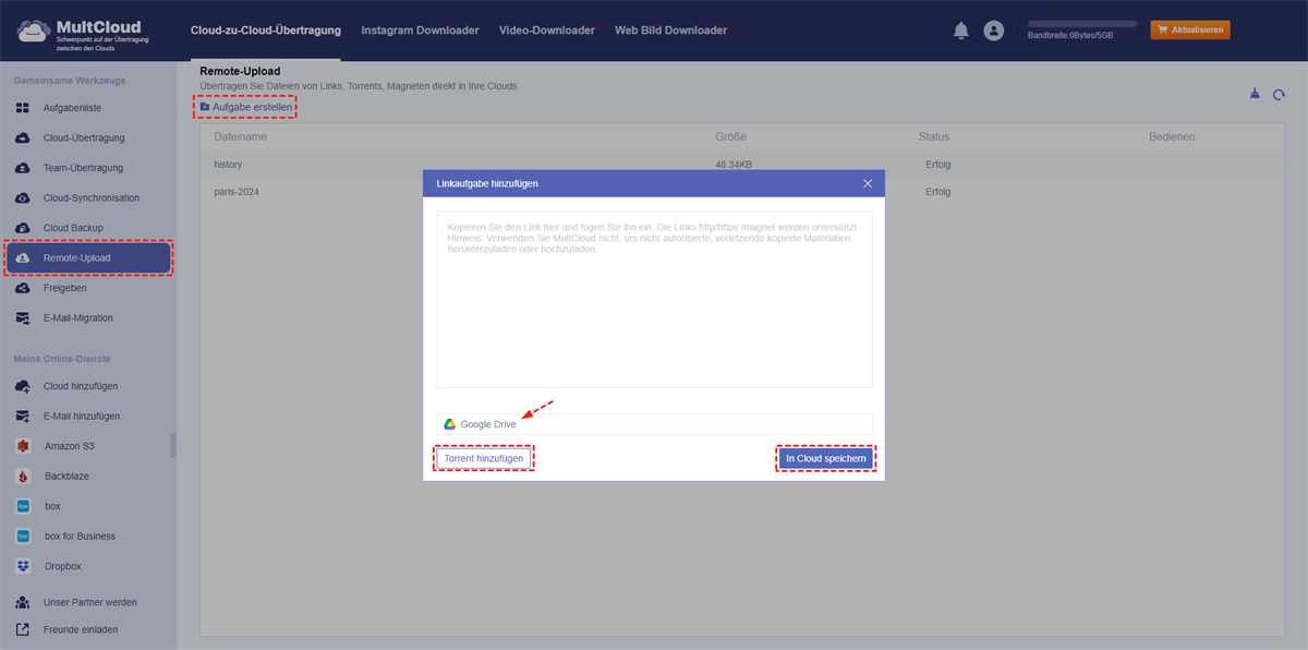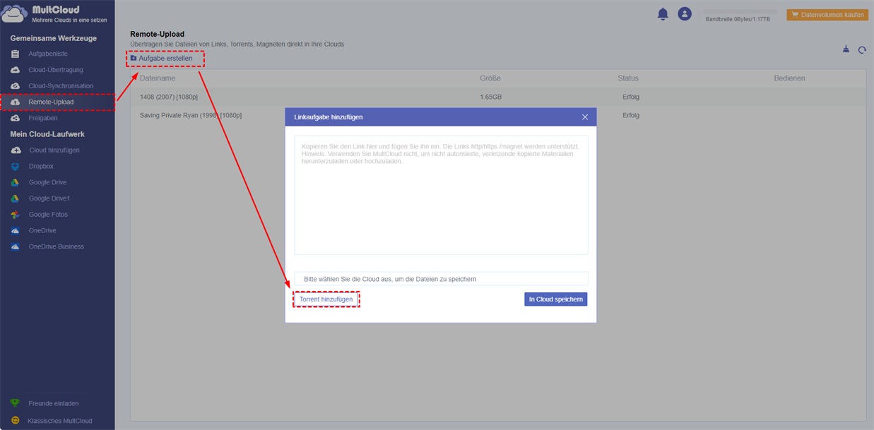 - Direkter Download von Torrent-Dateien. Sie können MultCloud als Online-Downloader für Torrents verwenden, mit dem Sie Torrent-Dateien direkt auf Google Drive herunterladen können, ohne lokalen Speicherplatz zu belegen.