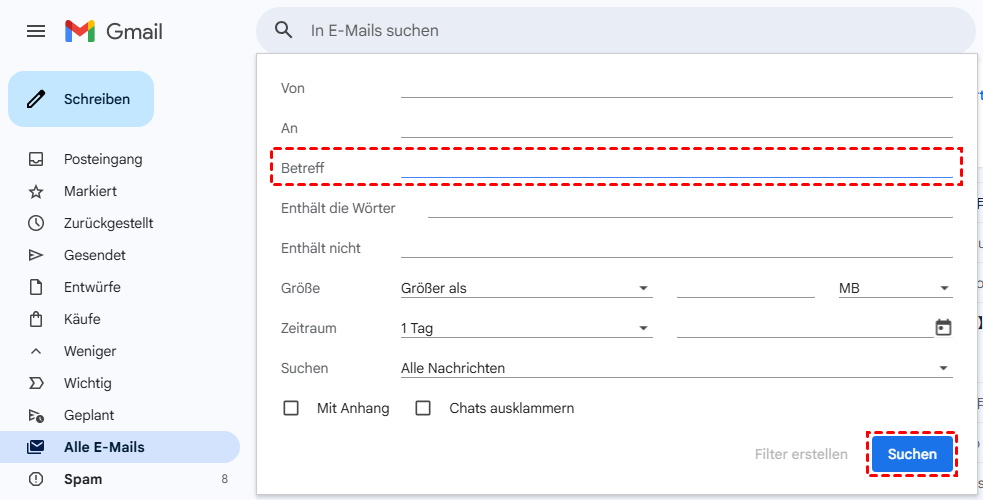 Methode 2: Erweiterte Suche verwenden, um archivierte Gmail-E-Mails zu finden