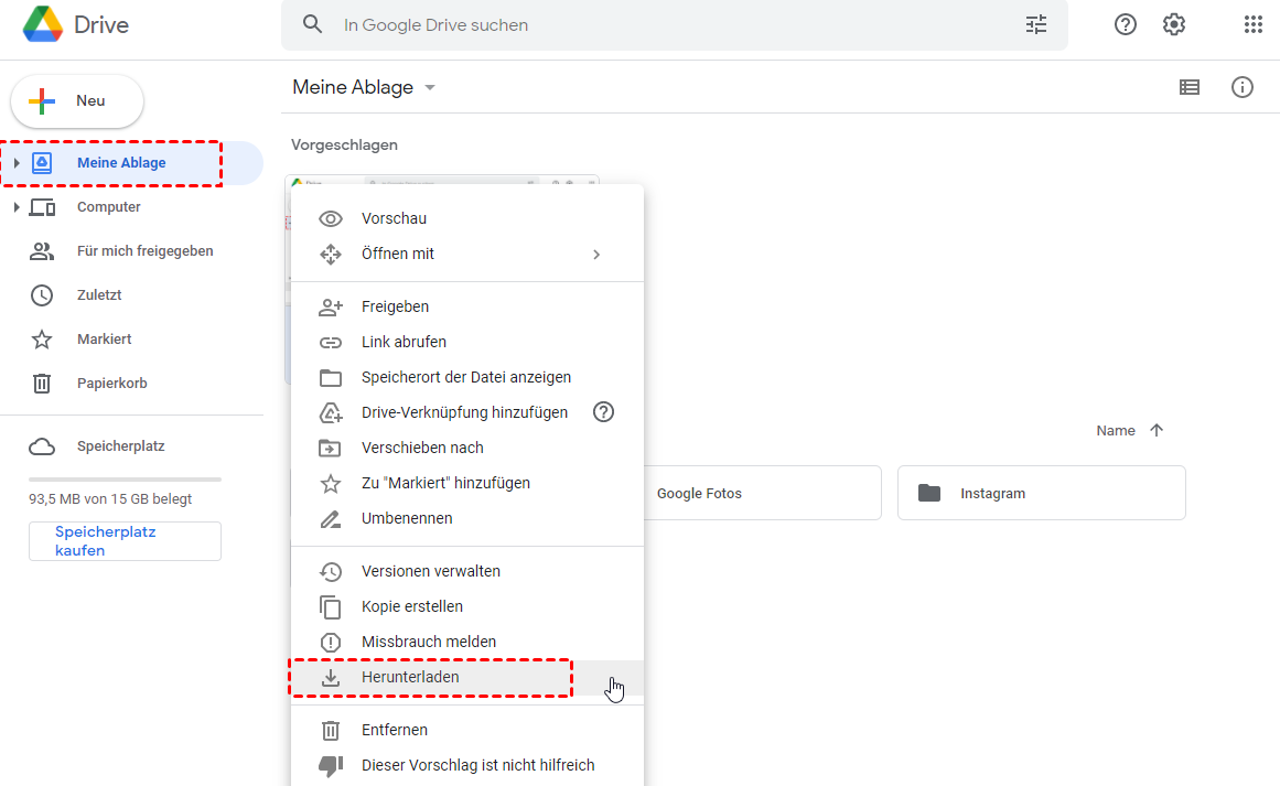 Schritt 3. Klicken Sie auf Google Drive und suchen Sie dann das Video, das Sie von Google Drive herunterladen möchten. Markieren Sie dann das Video und wählen Sie Herunterladen.