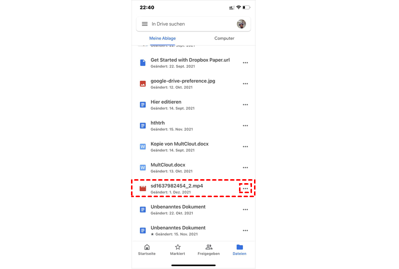 Schritt 2. Suchen und wählen Sie das Video, das Sie von Google Drive herunterladen möchten, und klicken Sie auf die Schaltfläche mit den 3 Punkten neben dem Video.