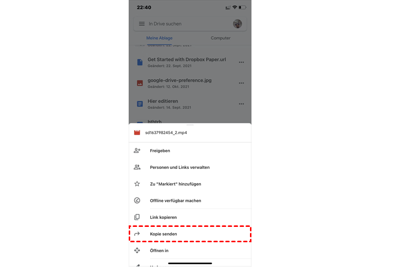 Schritt 3. Blättern Sie dann in der Menüliste nach unten und tippen Sie auf die Schaltfläche „Kopie senden”.