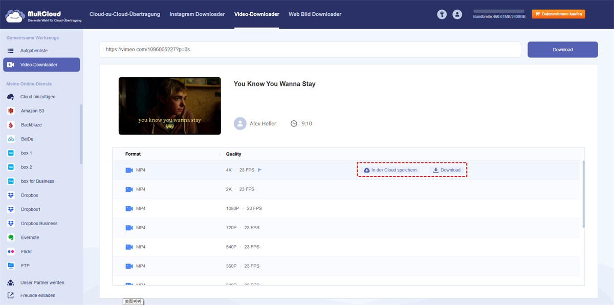 - Originalqualität. Mit MultCloud können Sie Vimeo-Videos in 4K, 2K, 1080p, 720p und vielen weiteren Auflösungen herunterladen.