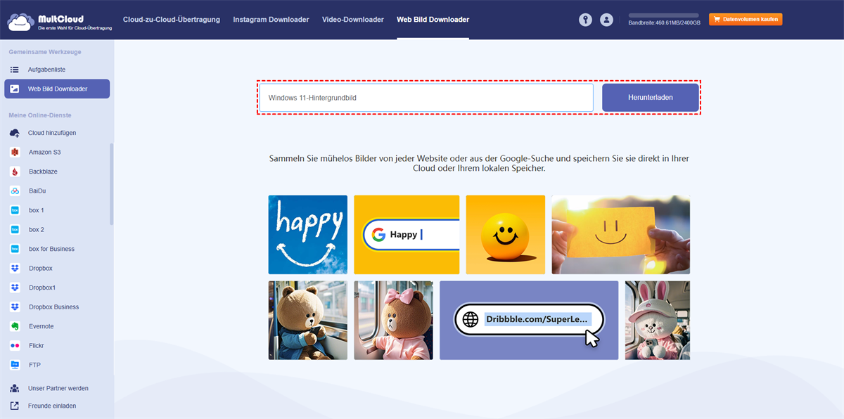 Um Windows 11-Hintergrundbilder effektiv herunterzuladen, stellen wir Ihnen hier den besten Anbieter vor: MultCloud, einen Online-Speichermanager für mehrere Cloud-Speicher. MultCloud ist nicht nur ein Tool zur Datenmigration, sondern auch ein professioneller Bild-Downloader. Lesen Sie die folgenden Informationen, bevor Sie sich entscheiden.