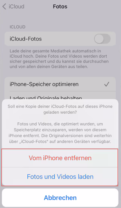 Schritt 1: Gehen Sie zu „Einstellungen“ > „[Ihr Name]“ > „iCloud“ > „Fotos“, deaktivieren Sie die iCloud-Fotos und wählen Sie „Fotos und Videos herunterladen“, um Fotos von iCloud auf das iPhone herunterzuladen.