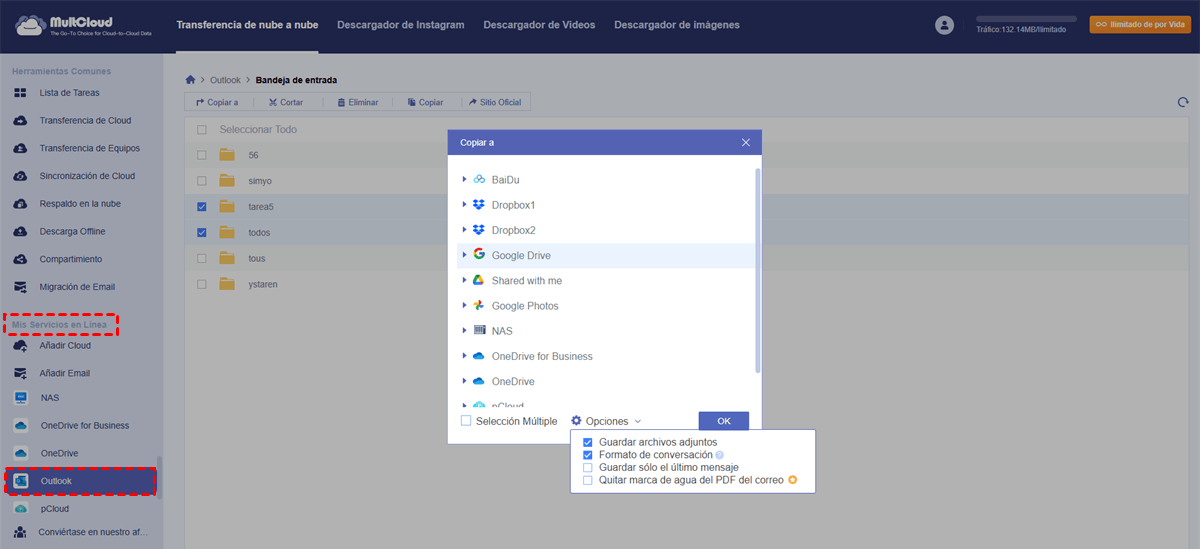 Métodos 1. Guardar todos los correos electrónicos de Outlook a Google Mi Unidad con MultCloud