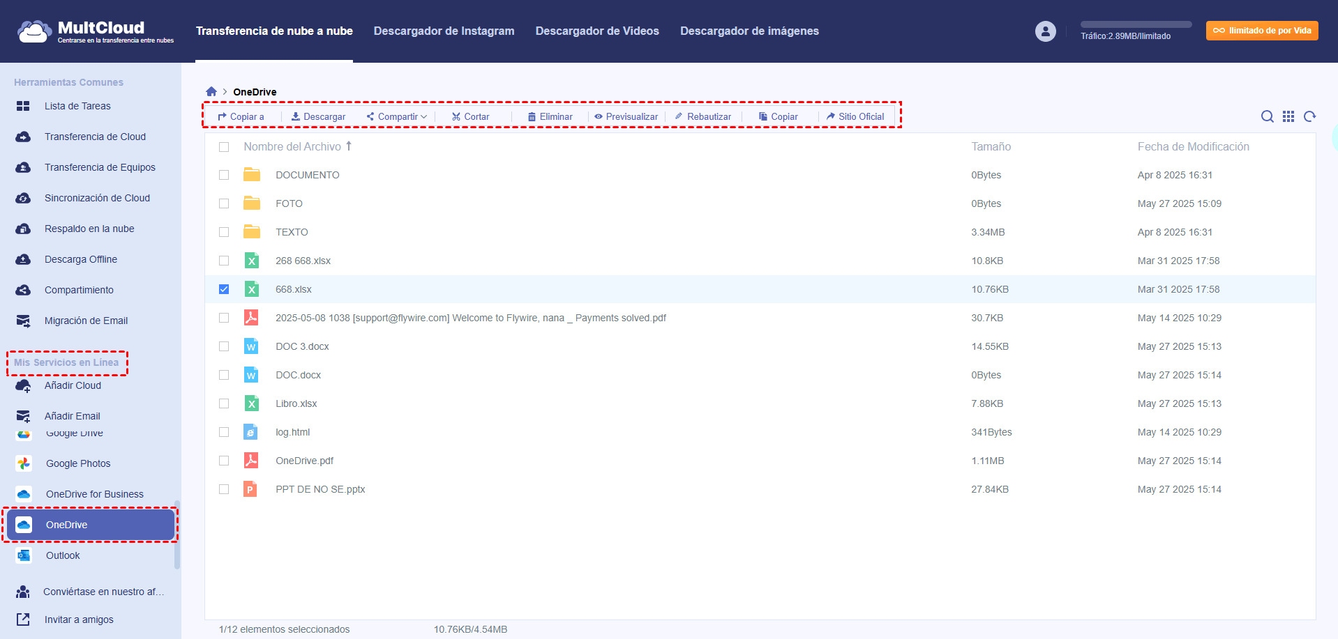 Paso 3. El OneDrive se abrirá automáticamente tras autorizarlo. Ahora puede subir, descargar, copiar, cortar, pegar, eliminar, renombrar, previsualizar o subir archivos a la nube en la página de OneDrive. O también puede compartir OneDrive con usuarios externos y con otros usuarios de OneDrive.