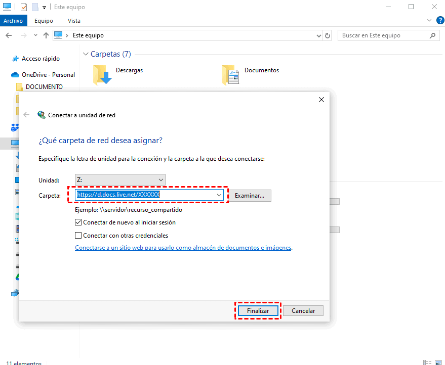 Paso 5. Pega el código CID en la casilla Carpeta de la ventana emergente y añade "https://d.docs.live.net/" antes del código. A continuación, haz clic en "Finalizar" para cerrar la ventana emergente.