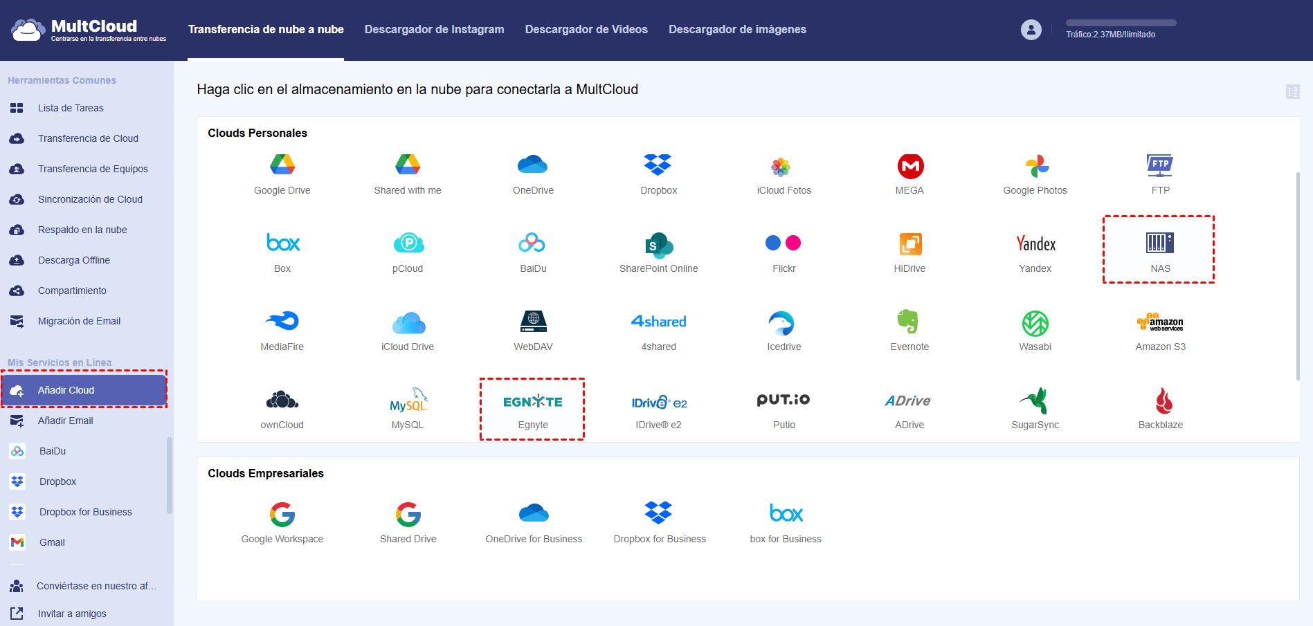 Una forma efectiva de sincronizar Egnyte con Synology NAS es utilizar el servicio de sincronización en la nube --- MultCloud. MultCloud es una herramienta basada en la web que permite a los usuarios gestionar y combinar múltiples servicios de almacenamiento en la nube, como Egnyte, Synology NAS, Google Drive, Google Photos, Flickr, SharePoint, OneDrive, Dropbox, Box, OneDrive para empresas, iCloud Drive, iCloud Photos, IDrive e2, entre otros.