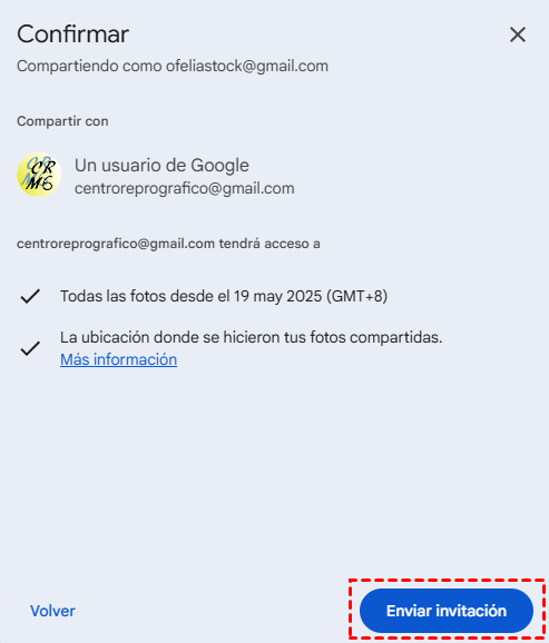 Paso 8. En la nueva ventana emergente, haz clic en Siguiente > Enviar invitación para volver a compartir con tu cuenta anterior de Google Fotos.